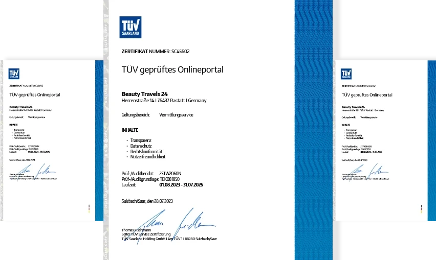 Als einzige Agentur im Schönheitstourismus sind wir seit 2012 TÜV-zertifiziert für unsere herausragende Servicequalität. Dieses Siegel garantiert Ihnen höchste Standards und absolute Zuverlässigkeit.